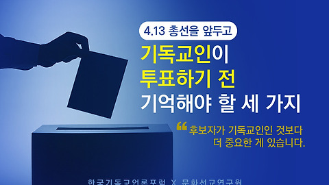 이에 선거를 앞두고 목회자는 성도들에게 어떻게 설교해야 할지, 이를 위해 어떤 노력을 기울여야 할지 그 기준을 제시합니다. (사)한국기독교언론포럼이 제안하고 문화선교연구원이 게시합니다.