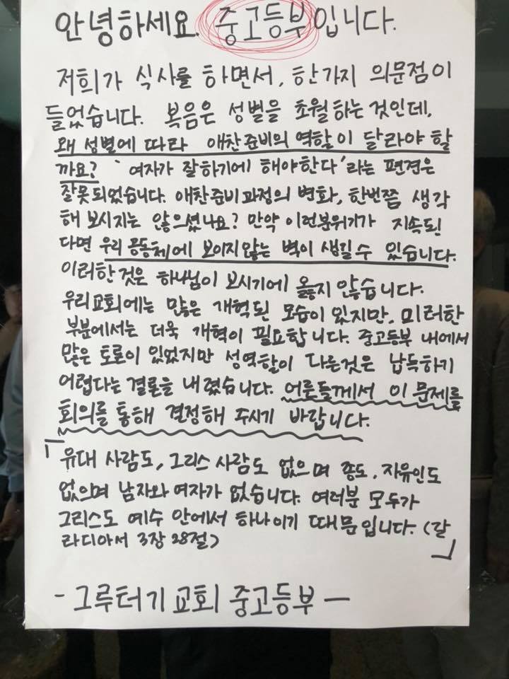 그런데 어른들의 의견 수렴이 시작되기 전에 중고등부 학생들이 먼저 자발적으로 토론을 했다 합니다. 그리고는 토론 결과를 대자보로 교회 내부에 게시해도 좋을지 담당 교역자(민재원 목사)가 문의를 해 왔습니다. 교역자가 주도하지 말고 학생들끼리 하도록 맡겨보라고 조언했습니다. 그랬더니 오늘 드디어 실행을 했네요. 중고등부 학생들이 교회 운영의 주체가 되어 의사 결정 과정에 자발적으로 참여하는 모습이 아름답지요?