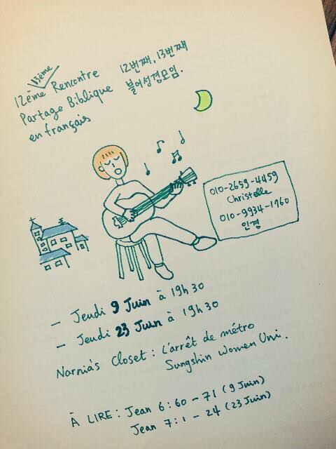 어찌보면 매주 화요일에 있었던 화요성경공부모임의 불어버전이었다. 옷장지기역할로 늘 함께 했던 나는 불어를 한마디도 못한다. 그렇기에 깊이 참여하지는 못하고 옆에서 서포트 하는 정도의 역할을 했다. 하지만 그들이 주체가 되어서 자율적으로 이 모임을 이끌어 가는 것이 좋았다.