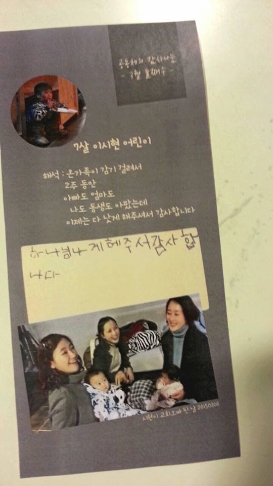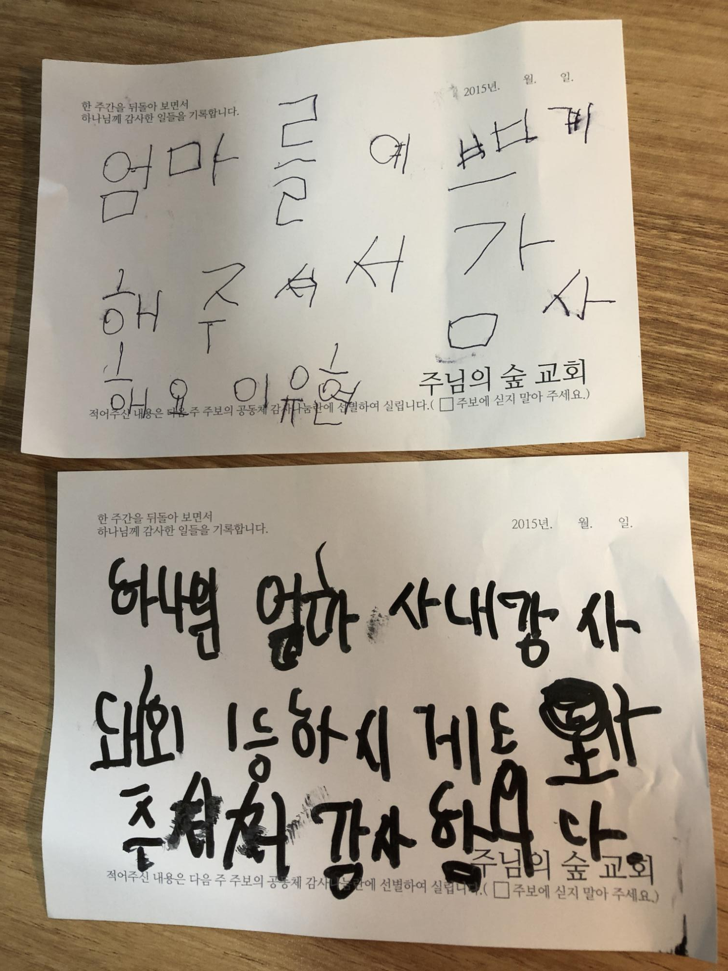 주님의숲교회 예배시간에는 감사카드를 적는 시간이 있다. 설교순서가 끝난 후에 그날의 말씀을 통해 들었던 감동과 한 주간동안 감사했던 내용을 적어서 예물과 함께 드리면 다음 주 주보에 실어서 공동체와 함께 공유한다. 예배시간이 지루한 아이들은 그 감사카드에 뭔가를 많이 쓰곤 한다. 어떨 때는 엄마 아빠를 그리기도 하지만, 때때로 꽤 기억에 남는 글들을 남기기도 한다.