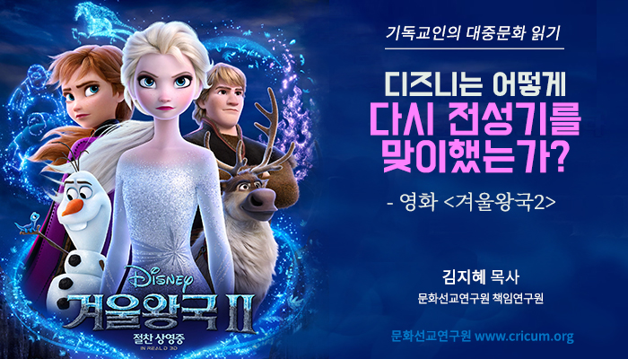 디즈니가 사회의 나아가야 할 방향을 디즈니로서, 디즈니스럽게, 그리고 오늘의 시대에 맞게 제시한다면, 한국교회는 어떠한가? 좋은 소식도 많았지만 유난히 갈등과 마음 아픈 일이 많았던 2019년이었다. 전도와 선교의 위기를 맞이하고, 세상의 빛과 소금이어야 할 교회가 신뢰를 잃는 시대에 디즈니의 약진과 <겨울왕국2> 흥행에서 얻을 교훈이 있다면, 본질 외에 다름 아니다. 우리의 관심이 여전히 성장과 성공에 머무르는 것에서 돌아서서 성도다움과 교회다움을 찾는 것, 한국교회가 터하고 있는 한국사회의 위급한 아젠다에 대해 화해와 평화의 예언자적 메시지를 실천하는 데 있어야 한다. 희망의 절기인 대림의 시기에, 예수 그리스도의 오심을 기뻐하는 것은 그분의 다시 오심을 준비하는 것과 같이 가야 한다. 교회와 세상, 하나님이 지으신 피조세계 가운데 만연한 거짓 평화를 바로잡고 “둘로 하나를 만드사 … 중간에 막힌 담을 자기 육체로” 허무신 예수 그리스도를 따라 다리를 놓는 화평이 되어야 한다.(엡 2:14) 그때 비로소 다음세대와 세상에 교회의 진정한 존재 의미를 밝힐 수 있을 것이다. ‘교회’의 가장 좋은 날은 아직 오지 않았다.