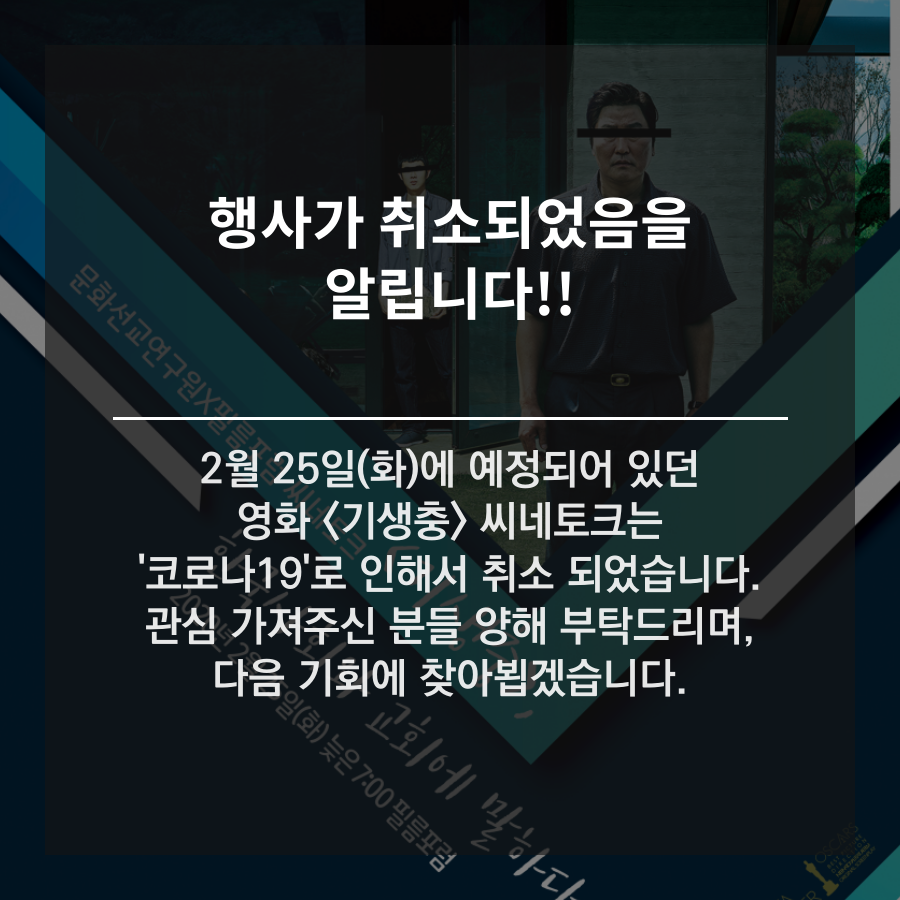 🚫행사가 취소되었음을 알립니다!!🚫2월 25일(화)에 예정되어 있던영화 <기생충> 씨네토크는'코로나19'로 인해서 취소 되었습니다.관심 가져주신 분들 양해 부탁드리며,다음 기회에 찾아뵙겠습니다.