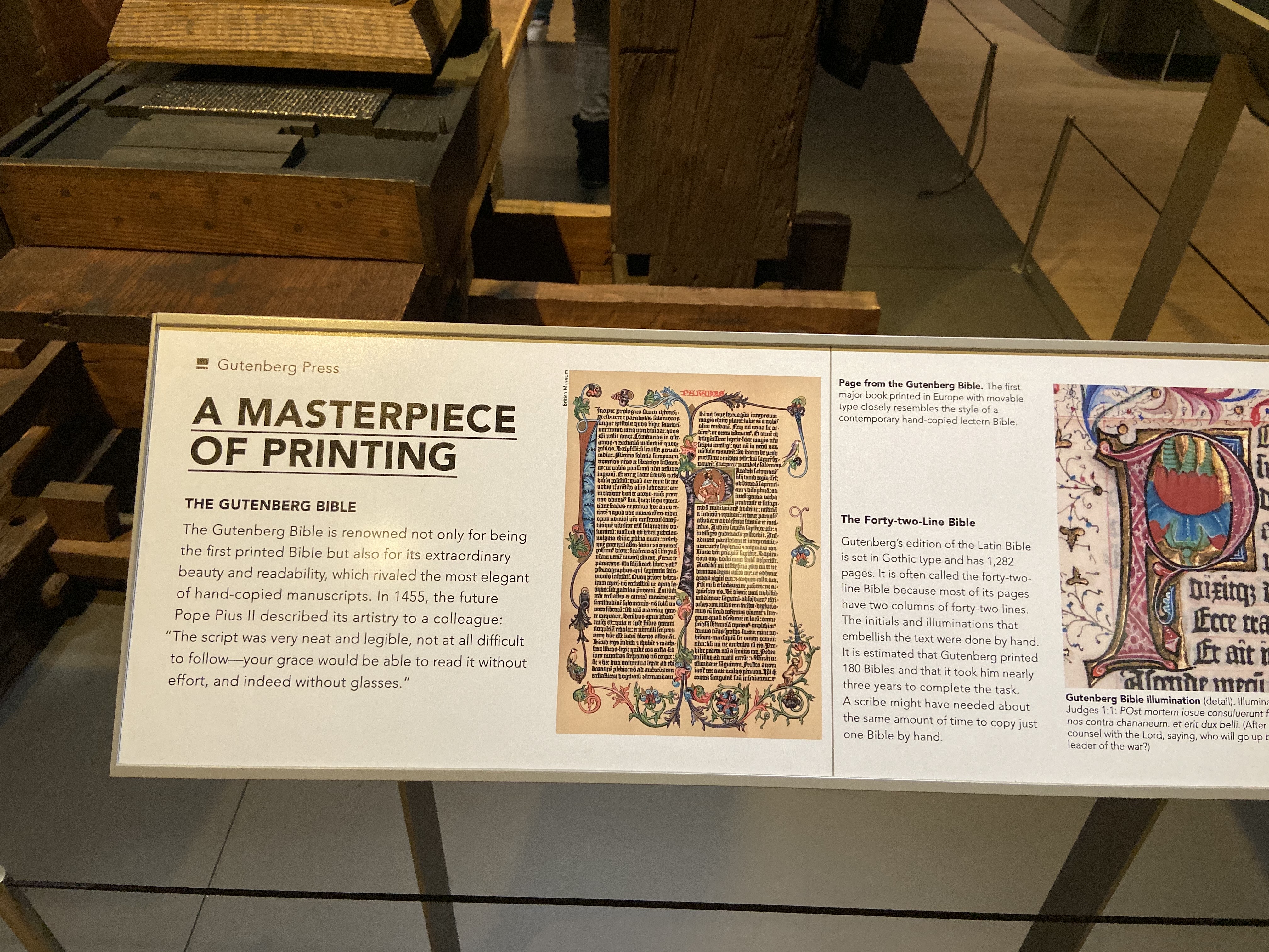 워싱턴 D.C에는 스미스소니언 기반 엄청난 뮤지엄 단지가 주제별로 있다. 그런데 그 거대한 뮤지엄들이 모두 무료입장이다. 이 뮤지엄만 구경해도 일주일이 모자랄 지경이다. 그러나 아쉽게도 이곳 성경 뮤지엄은 입장료가 있다. 그래도 뮤지엄에 들어서는 순간 돈이 아깝지 않다는 생각부터 든다. 구텐베르크 성경 원문, 라틴어로 쓰인 창세기 첫 80줄이 장식되된 입구는 스케일부터 압도적이며, 각 엘리베이터 사방에 설치된 모니터로 이집트와 팔레스타인 땅을 보여준다. 이 글은본인의 관점에서 박물관을 주제별로 정리한 것이다.