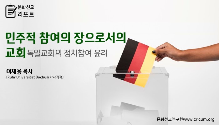 독일교회는 국가 또는 정치와 떨어질 수 없는 관계에 있다. 1517년 종교개혁 이후로 교회는 독일의 역사에서 가장 중요한 역사적 주체 중 하나였다. 그러나 지난 500여 년의 시간 동안 독일교회의 정치참여는 수없이 많은 영광과 타락 그리고 성공과 실패가 반복되었고, 이에 2017년 종교개혁 500주년을 맞이하여 독일교회에서는 하노버에서 “일치와 갈등: 정치는 토론이 필요하다“ (Konsens und Konflikt: Politik braucht Auseinandersetzung)는 제하의 10가지 명제로 구성된 성명서를 발표했다. 이 중에서 이번 호에 간략하게 살펴보고자 하는 것은 10번째 항목인 "민주주의적 참여의 장으로서의 교회" (Die Kirchen als Orte demokratischer Beteiligung)에 수록된 내용이다. (원문주소: https://www.ekd.de/konsens-und-konflikt-10-die-kirchen-als-orte-demokratischer.htm)