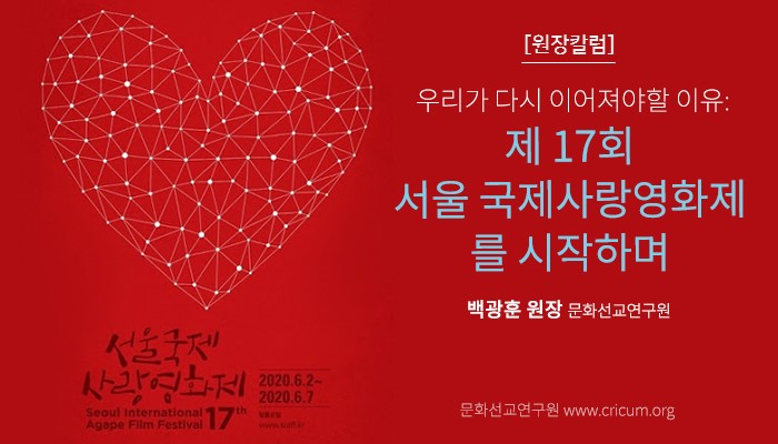 이러한 시대적 과제 속에서 서울국제사랑영화제를 개최하게 됩니다. <경계를 넘어서는 새로운 시선>이라는 모토로 17년을 이어온 영화제는 그래서 더욱 소중하고 각별합니다. 단절된 세계들을 이어주는 매개로서 영화는 우리가 외면하기 쉬운 또 다른 세상으로 우리를 이끌어주고, 때론 잃어버린 세계를 발견하게도 하며, 스스로를 고립시키는 자폐적 유혹에서 벗어나도록 도와줍니다. 특별히 이번 영화제를 통해 우리는 서로 다르지만 존중받아야 할 우리의 이웃들, 단절과 소외, 외로움 속에서 고통하고 있는 사람들, 갈등과 미움을 믿음과 용서, 사랑으로 극복하려는 용기있는 이들, 인간과 자연의 건강한 연결을 모색하는 몸짓들, 우리시대가 양태한 분절의 방식을 넘어 다양한 관계 맺기와 삶의 이음들을 찾아가는 이들과 영상으로 하나 되는 특별한 경험을 하게 될 것입니다. 그리고 이 모든 일은 세상을 이처럼 사랑하사 독생자를 주신 하나님의 먼저 이어주심의 사랑을 본받아 가는 신앙인들의 책임적 응답이 될 것입니다.