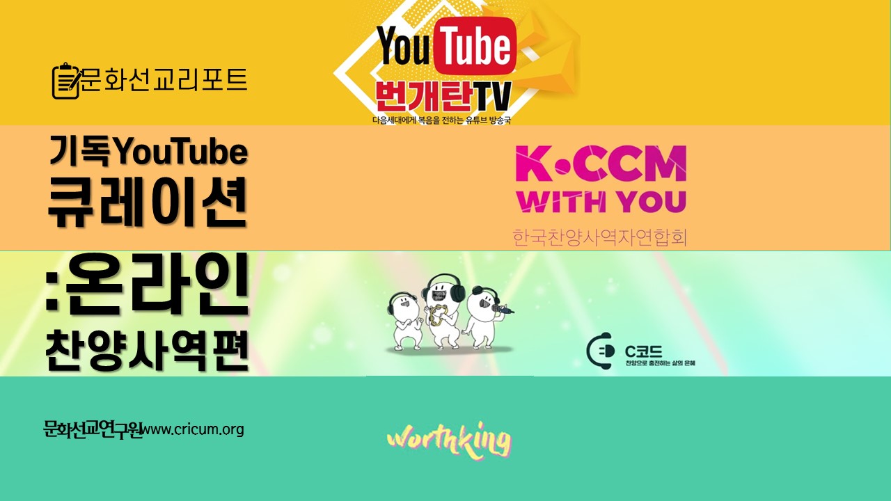 교회를 비롯한 사회 전반이 비대면 상황에 놓여있는 요즘. 예전처럼 찬양 집회에 가서 직접 보거나 들을 수 없는 상황임에도 불구하고, 오히려 삶의 자리에서도 찬양이 멈추지 않도록 보여주고 들려주는 유튜브 채널들이 있다는데..? 이번 편은 코로나19 바이러스 상황에서도 온라인이라는 장을 이용하여 복음 전달에 앞장서는 기독교 문화 콘텐츠들을 소개하고자 한다.