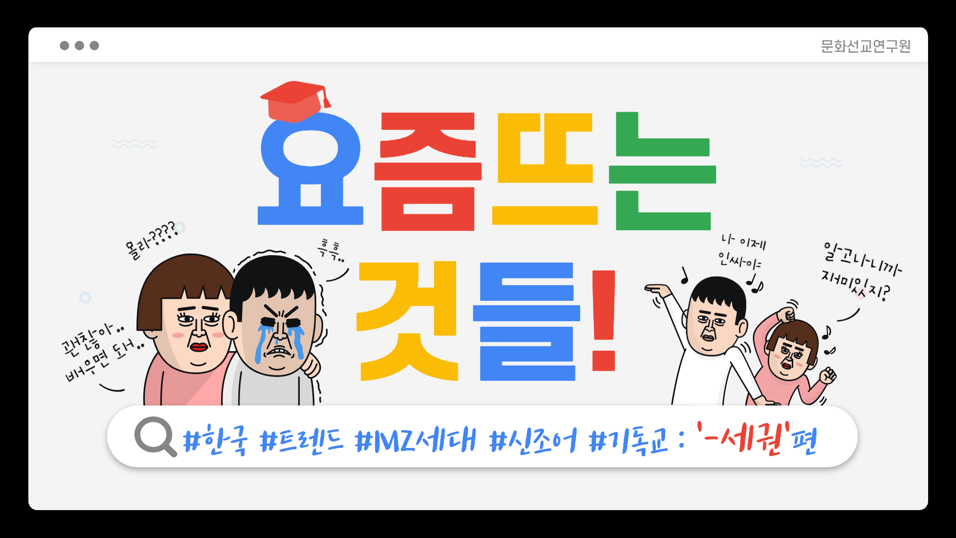 그래서 문화선교연구원에서 준비했습니다! 아는 만큼 보이고, 들은 만큼 흥미로운 것들! 일명 <요즘 뜨는 것들>이라는 코너를 통해 요즘 뜨는 이슈, 유행, 현상, 트렌드 등을 매달 한 주제씩 선정하여 여러분에게 소개해드리겠습니다!