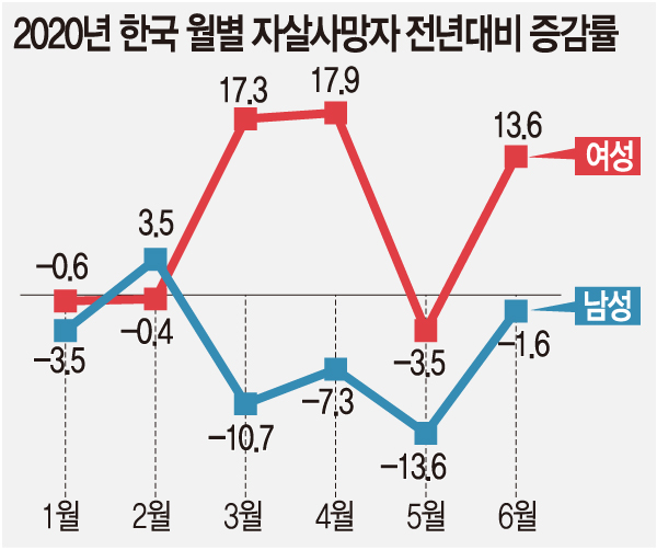 문제는 여기서 끝나지 않는데, 1~8월 20대 여성의 자살시도(32.1%)가 전 세대 통틀어 가장 높았다. 1990년대생 20대의 자살률이, 1950년대생이 20대일 때보다 여성 7배, 남성 4배에 달하는 등 청년 자살률이 높아지고 있음에 경각심이 필요하다. 원인을 단순히 심리적인 데서만 찾아서는 안 되는 부분이다.