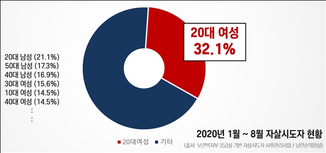 문제는 여기서 끝나지 않는데, 1~8월 20대 여성의 자살시도(32.1%)가 전 세대 통틀어 가장 높았다. 1990년대생 20대의 자살률이, 1950년대생이 20대일 때보다 여성 7배, 남성 4배에 달하는 등 청년 자살률이 높아지고 있음에 경각심이 필요하다. 원인을 단순히 심리적인 데서만 찾아서는 안 되는 부분이다.