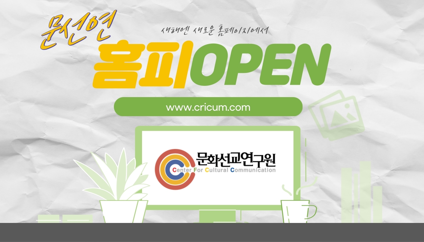 지금 접속하고 계시는 기존의 www.cricum.org 계정이 약 10여 년 동안 홈페이지의 역할을 감당해왔으나, 이용하시는 분들을 생각하면 항상 아쉬움이 있었는데요. 이번에 문선연의 콘텐츠들을 보다 잘 이용하실 수 있도록 개편했습니다. 기존 계정은 당분간 그대로 유지될 예정입니다. 하지만 앞으로 업데이트되는 부분은 새로운 홈페이지 www.cricum.com 에서 이루어질 예정이니 많이 찾아주세요. 늘 문화선교연구원에 관심 가져주셔서 감사드립니다! 새로운 홈페이지에서 뵈어요^^